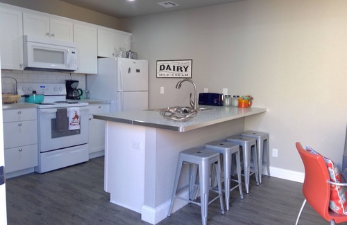 The floor plan for this side of the duplex allows for a shared living, dining (at the large island), kitchen area. There is a private bedroom/ensuite bath on each side of the common living area. There are queen beds in each bedroom. Both ensuite complete baths are fully stocked. The open kitchen has all new appliances and a large, retro diner looking island that seats 4 comfortably. The kitchen is also fully stocked, as is the separate laundry room. A Smart TV in the common area provides access to all your streaming services. You have access to the free, high speed Cox WiFi, as well. The Kottage is decorated with many unique collectible treasures and local art.
