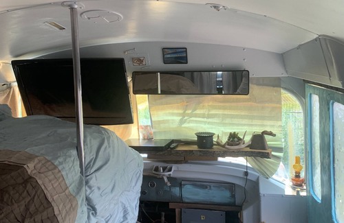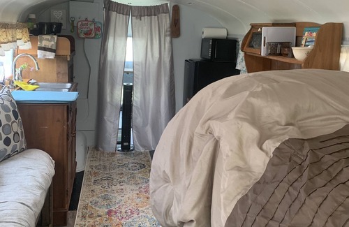 Come and stay in a 1950’s Bus, The luxuries of home full kitchen with sink, electric burner stove top and fridge. AC and desk in the main area along with a kitchen table for dinning. Bathroom has a closet, shower, sink and toilet. The bed is raised but not as high as a bunk, bed is an XL Twin but has added cushion space for more sleeping area room. Great getaway ideal for one person stay. Outside landscaping and sitting area with a garden pond and grilling. Enjoy a campfire outside on the patio and also a propane stove inside to keep you warm and toasty!