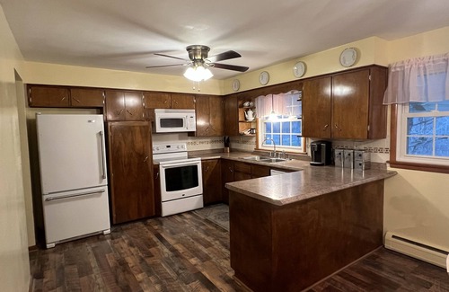 Step back into time in this cozy and charming 1959 mid-century-styled ranch house. Set on a sprawling 5 acres with a beautiful creek in the backyard, enjoy the fresh country air on the back porch and the wildlife such as deer and turkeys that frequent the property. Located only 7 miles from the Shenango River Lake/Dam and 12 miles from Chestnut Run Swim Beach. This is a peaceful and quiet property perfect for any stay. There is an area for a campfire in the backyard. Ring outdoor security camera located outside garage door.