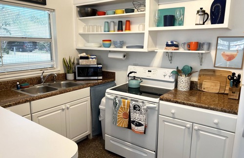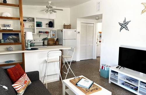 You will love this adorable 1B/1B cottage located two short blocks away from the beach, bars, restaurants and shops. The open floor planfeatures terrazzo flooring throughout for easy clean up after a long day at the beach! The living room has a futon and large flat screen TV. The bedroom has a king bed with large closet and bathroom has a tub/shower combo! We manage two units side by side, perfect for couples or small families that want to travel together but have their own space. Each unit is equipped to sleep two adults and one to two small children on the futon sleeper.