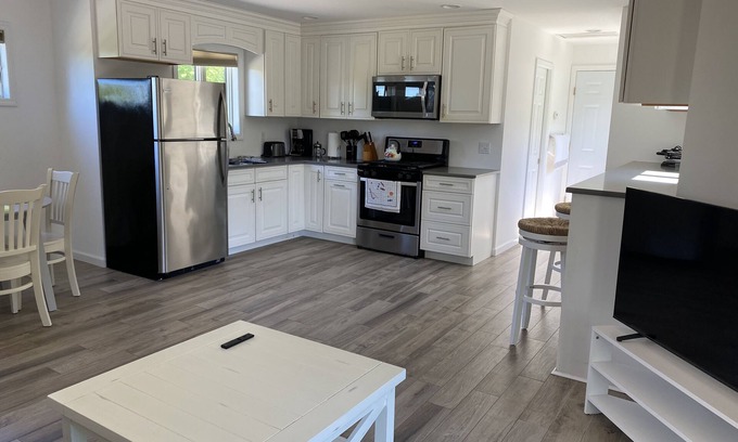 Take it easy at this unique and tranquil getaway. 1 BR 1.5 Bath Cottage on the Shinnecock Bay in Hampton Bay. The cottage is located on a private dead end street on a waterfront lot. Please note the cottage is set back from the water with the main house being directly on the water. The cottage enjoys water views and great bay front breezes. It's located 2 mi to downtown Hampton Bays (has a LIRR train stop) and a 7 min drive to gorgeous Ponquogue Beach. The cottage was built in 2016. We just bought the house so it’s newly furnished with brand new furniture. Pets upon approval.