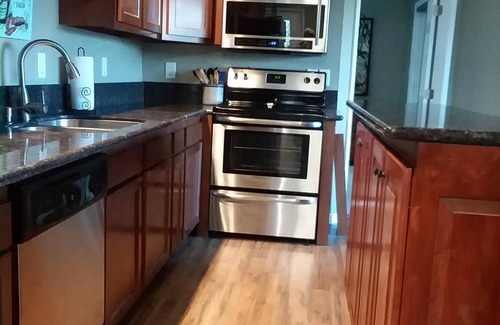 Light and airy 1BR 1.5BA living at the Sandswept Carriage House starts with a cathedral ceiling open floor living plan from the granite/cherry kitchen to the spacious living room finishing with the extra touch of two bathrooms. Granite counter tops, cherry island, custom tiled shower in the bedroom ensuite, and beautiful flooring all combine to create a spacious sanctuary after your vacation or work day all while being steps from the white sandy beach of Ocean View, Norfolk, VA. No streets to cross! Offstreet parking.