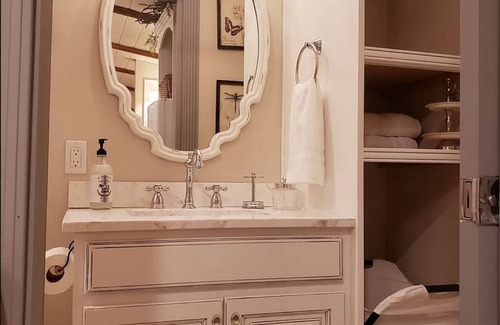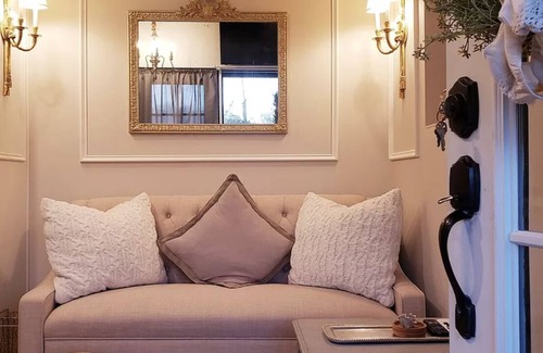This property was featured in Home & Garden magazine and is surrounded by gardens and greenery, with tumbled travertine floors and patio, ornate finishes and decor. 1 bedroom, 1 bath, full kitchen, living room and HDTV with video streaming. High speed Wifi (20-60mbps)! Free off-street parking for 1 car. Laundry room with full size washer and dryer. Private fenced yard with outdoor dining set, BBQ, lounges, fountain and deck.
