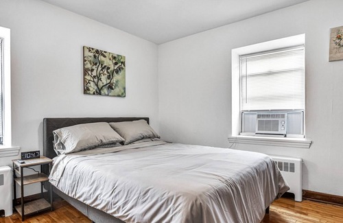This apartment has one bedroom with a queen size bed. The luxurious new bed has sumptuous sheets and bedding. The bedroom has one window, two closets, a nightstand with an alarm clock, a ceiling fan with a lamp, and a wall-mounted SmartTV, so you can watch your favorite shows at night.