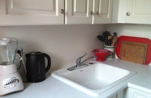 -Full kitchen- electric kettle, toaster, plates, glasses, utensils and cookware.