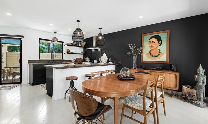 - Breathtaking Back Patio: Bask in comfortable outdoor seating as three sliding doors open to the expansive patio, revealing stunning views of the San Jacinto Mountains—a perfect backdrop for cocktails or delightful evening gatherings.