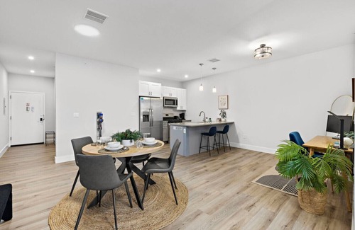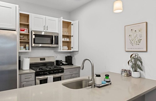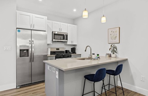 Discover NYC in style from our BoHo-Luxe 1B1B unit with 9ft ceilings, just minutes from Newark (EWR) and NYC airports (LGA, JFK), with the Light Rail and grocery shopping only 5 minutes away. Unwind in a cozy memory foam queen bed, relax on the comfy couch, and stay productive with an office area, high-speed Wi-Fi, and a 55" Smart TV. With premium toiletries, a fully equipped kitchen, and an in-unit washer/dryer, everything you need for a relaxing, seamless stay awaits.