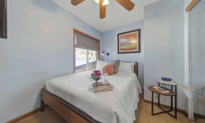 Bedroom: Queen bed, closet with full-length mirrors, ceiling fan, cozy linens, and natural light