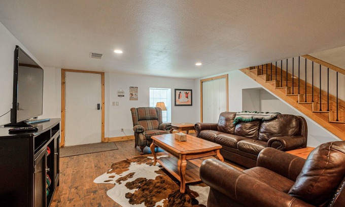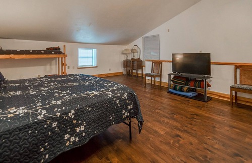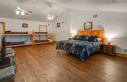 Oversized upstairs open floor plan with 1 king bed and 3 twin-over-twin bunk beds.
