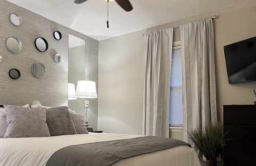 All new throughout! 1 bedroom with queen and pull out in living room, washer/dryer, fast internet, smart TVs, and dedicated work space. Pet friendly- Everything you need to feel at home for your work or pleasure stay! Ring security system with external cameras.