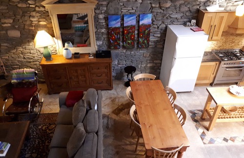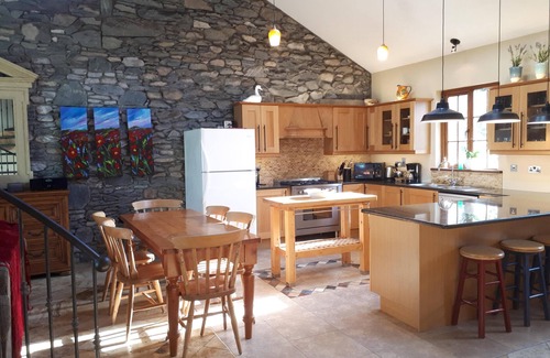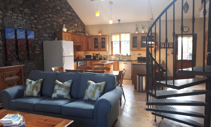 Cozy & Comfortable at The Priory Killarney Courtyard Cottages - Relax in the great room of vaulted ceilings and exposed beams ceilings. Teach Mor is a two-level, 3 bedroom with 2 queen-sized beds (bedroom number 2 has a single bed as well) 2 bathrooms, and upstairs has a queen plus a single bed, an open plan cottage with a large sitting room/kitchen. Built in 2007. The kitchen is fully equipped and there is also a washer/dryer. Sleeps 8 comfortably.