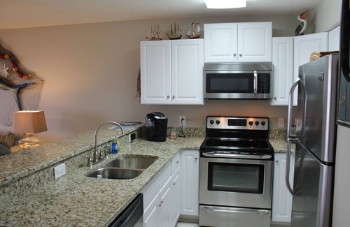Our kitchen has granite countertops, stainless steel appliances, and is fully furnished with cookware and utensils. We have a Keurig on the countertop, so just bring your K-cups (Mr. Coffee in cabinet if needed). New full size LG high efficiency washer and dryer for any clothes or towels you may want to wash.