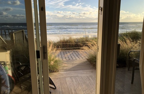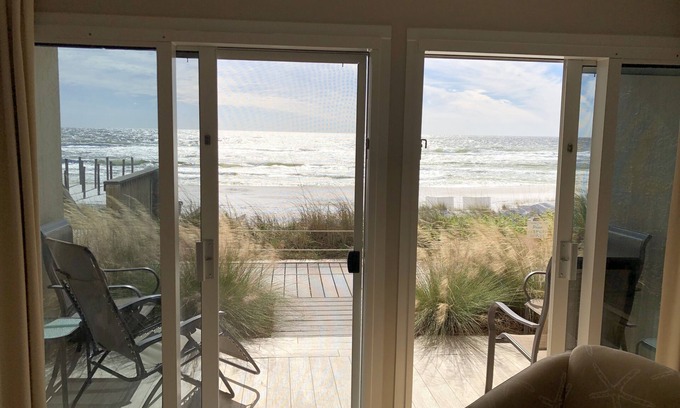 This unit includes one **complimentary** beach set-up each day (two chairs and one umbrella). Watch the dolphins swim (yes, we see them a lot) while you sit on the patio listening to the waves! There is a pool on the front side of the building with lounge chairs as well. Our building has two grilling areas at each end of the boardwalk (4 grills total), so grilling a steak or burgers is no problem.