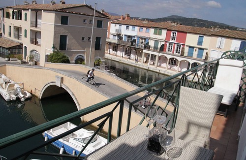 Just 10mins from the beaches,and the Prarie de la Mer classy 'village',with its exotic palm trees,and lodges, and summer entertainment: with superb views across the water to Saint Tropez,from the chic bar: and mins from a unique stroll to the headland walkway by the marina: and also from a 'Plat Du Jour' or seafood restaurant, or pizzeria,or boulangerie, or a market, or a boat to hire, or just a very relaxing canal waterside walk, is our airy comfortable 1st floor waterside apartment.