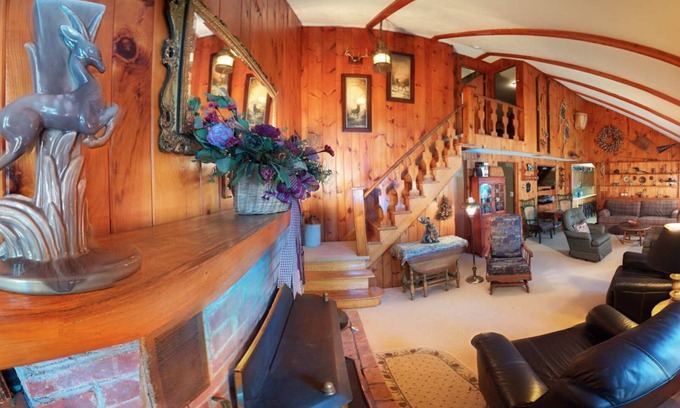 ___ LIVING ROOM ___ An open floor plan with high cathedral ceiling, nostalgic decor, wood fireplace and knotty pine interior walls. The living room has several southern facing windows that allows the sun light in with views of the lake and swimming area.