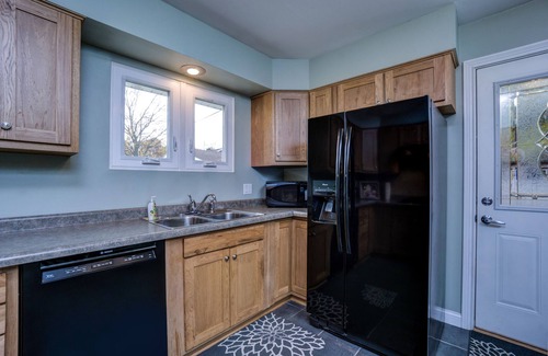 Affordable way for all of your group to be together in this 4 Bedroom, sleeping 10-12 people. This tri-level offers 3 King Bedrooms with a full bath on the upper level and 2 Queen beds and a sleeper sofa in the lower level with a family room and 60" TV with surround sound and Blue Ray DVD, and a full laundry room. Relax on the main level living room sofa's and enjoy a 60" TV and the full service Kitchen with another full bath! Only 2.2 miles to the ND campus and 2 miles to shopping and restaurants! Convenient and comfortable. A sure way to enjoy your stay in South Bend!