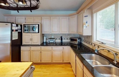 3 bedroom, 2½ bathroom, beautiful and spacious home w/loft and garage. Enjoy mountain views from almost every room in the house! Kitchen is fully equipped, including upgraded stainless appliances, duel fuel range and granite countertops w/extended breakfast bar w/stools. 2 pantries, one with beverage fridge. Kitchen opens up to dining room and great room w/large, flatscreen TV w/Comcast Cable. Loft offers TV with Roku connection. Oversized master suite with king bed, sitting area (with broad mountain view!) and bathroom with jetted tub and separate shower stall. 2 bedrooms located on the roadside of the home, each with queen bed. Full hall bathroom (shower) located between the bedrooms.
