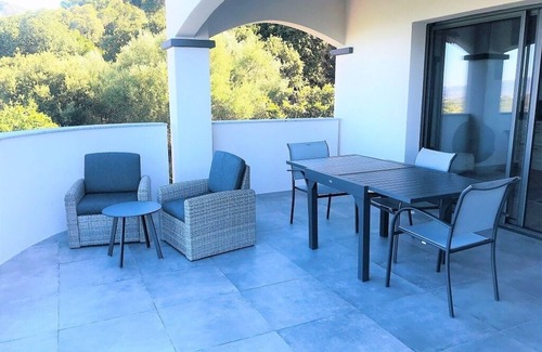 2 beautiful private terraces. One, facing west, with panoramic views of the Gulf of Ajaccio and the Sanguinaires Islands and one in a pretty patio.