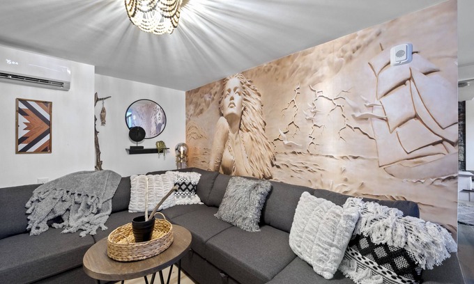 Head downstairs and you'll find a washer and dryer, and colorful sunken living room with 4K Smart TV. The lower level bathroom has a standup shower and modern fixtures. The bedroom on this floor features exposed brick wall and another comfortable king sized bed.