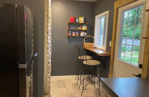 The cottage has a mini-split for heating and cooling, propane fireplace with remote, full size washer and dryer and outdoor firepit. There are ceiling fans in bedrooms and living room. One queen and one full bed - both very comfortable. Internet access is 12 Mbps - adequate for most tasks and TV streaming. It is a five minute walk to the beach. The large backyard has a firepit, you may have to buy wood.
