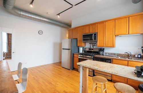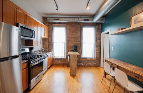 Directly above a stylish neighborhood cocktail bar, you can enjoy Chicago night life right at your door steps .
