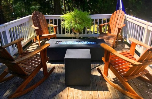 Outside you can relax on the deck with propane fire pit, comfy chairs and enjoy a cup of coffee or a glass of wine. Feel the cool breeze from the water as you sit and chat outside. The backyard features a custom built BBQ table and seating area.