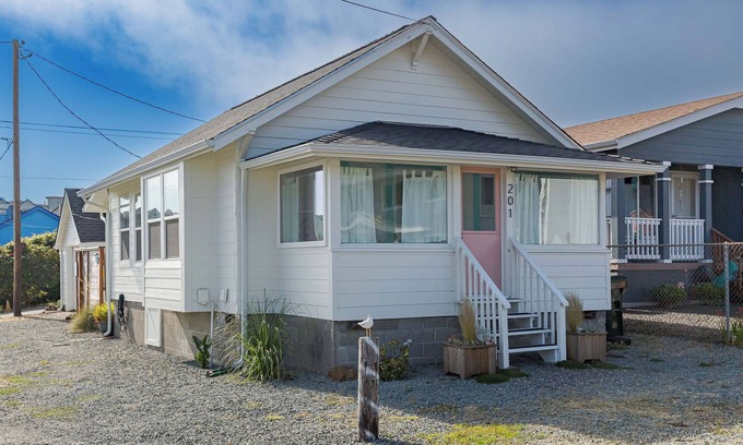 This vintage bungalow is the perfect place to relax with family or friends at the Oregon Coast. Located just two blocks from the ocean and one block from all downtown Rockaway Beach has to offer. The home is located on East side of Highway 101. Packed with vintage charm and cozy furnishings. Sleep soundly with in either of our two bedrooms. One queen bedroom and one bedroom with two twin beds. Equipped with a fully stocked kitchen, laundry/mud room, and full bathroom with stand-up shower. The cozy sun porch is perfect for sipping your morning coffee or squeezing in a little remote work. Have lunch el fresco in our peaceful and private backyard space.
