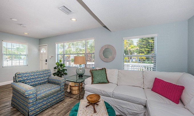 Enjoy St. Pete Beach in this trendy coastal home with 2 bedrooms and 1 bath. Centrally located 2 blocks from the beach 1 minute walk and close to all the local restaurants and entertainment. Outdoor patio area & BBQ. Additional private cottage available. WIFI, smart TVS in all rooms, A/C. Parking space included.