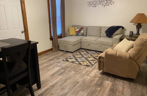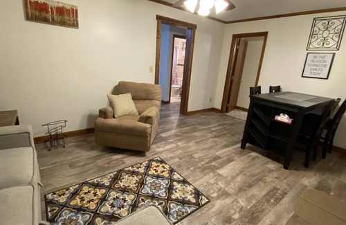 Centennial Cottage is centrally located within the Shawnee National Forest and surrounded by countless activities and adventures. Outdoor enthusiasts are perfectly located to access a plethora of hiking trails that range from novice level to the enthusiastic boulder or rock climber. Nearby lakes and streams provide opportunities for kayak rentals, canoe rentals, or fishing. Hunters and fisherman will find a comfortable space to sleep here and room for parking trailers. Visit the Shawnee Hills Wine Trail or any of the nearby breweries. Attend any of the many festivals held in the area year-round. Find your palate's desire at any of the unique restaurants in the area. Take home a treasure from one of our many local artisans, there's even a Southern Illinois Pottery Trail! Live Music is available at countless venues as the area boasts some of the finest original and cover artists. Start your day at the eclectic breakfast guru, The Iron Whisk, with a unique breakfast cocktail and their famous dutch baby entrée. Head to Alto Pass, IL, for an easy hike on the historic Quetil trail. Stop at Rendleman Orchards for a step back into time on a working orchard farm and leave with a treat. Then quench that thirst with a free wine tasting and a discounted bottle of wine at The Peachbarn Winery & Café with your leashed Fido and enjoy a scrumptious lunch and live music. Continue up the road to gawk at the colossal view of the Forest seeing all the way to Missouri at the Bald Knob Cross attraction on the second highest point of Illinois. Swing by Alto Clay works and pick up a unique piece made by hand and fired in one of the country's few wood-fired kilns left. Grab dinner at VonJakob Vineyard or head back to the Cottage for a wood-fired pizza from That Pizza Place or top your night off with a cocktail at the famous dive bar, Fuzzy's, just 2 blocks from your Cottage. There's something for everyone here in Southern Illinois!