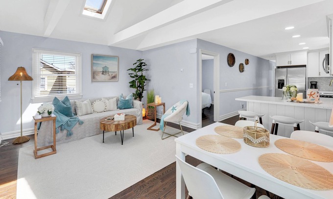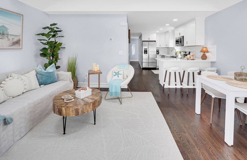 Consider this house your home away from home while you visit Lake Como. Summer House with everything you need! This lovely property features 2 bright, clean and comfortable bedrooms, each with Queen Beds, and closets. A brilliant bathroom with a bathtub, and a cozy living room with a Queen sized sofa bed, a skylight and a foldable dining table for 6. Guests can enjoy amenities like an outdoor furnished patio with BBQ, Wood burning FirePit and lounge chairs, washing/drying machine, Central Air, Heating, WiFi, Printer, TV, Available Beach accessories and more. An extra Den room available for use. Driveway Parking for 3 Cars with additional parking on the street available. Enjoy your time in Lake Como/Belmar at our Bright and Newly Renovated Beach House.