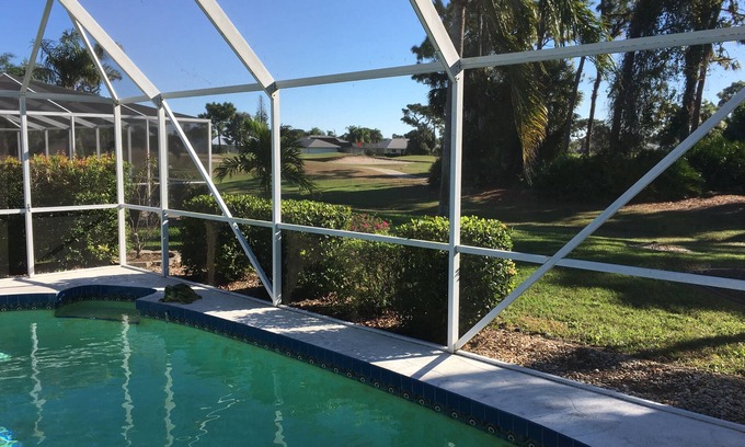 A golfer’s delight! Located on The Palms 18 hole golf course with four courses within 10 minutes of this 2 bedroom, 2 bath air conditioned house with private screened in pool. Family room with a pull out couch. Master bedroom with queen size bed. Guest bedroom with 2 twin beds. Can sleep at least 5 or 6 total. Washer and dryer in attached garage. Lots of closet space. Includes cable and Internet access. Quiet deeded community with local hiking trails within minutes and only 15 minutes away by car from Englewood beach, shops, restaurants and night life. Located between Venice and Port Charlotte. Many boat tours and boat rentals available in the area. Catch a Stone Crabs “Tampa Bay Rays” minor league baseball game only a half hour away. There is no Hot Tub or Grill at residence.