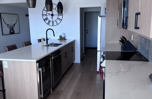 Walk right in the front door to the main living area of the duplex. The living room has large windows, cozy couches and an electric fireplace. It’s the perfect spot to drink your morning cup of coffee or wind down at the end of the day with a glass of wine and the sunset. There is also a fully equipped kitchen with large pantry and dining room that has direct access to the hot tub – perfect for soaking in after a day of adventures!
