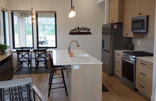 Located in New Harmony, with dramatic views of the Kolob Canyons section of Zion National Park, enjoy what this 2-bedroom house has to offer. This new, modern guest house situated on 5 acres comes equipped with all the essentials for a comfortable stay, including WiFi, heating, 55" TV and a stacked LG washer/dryer unit. Fully equipped kitchen to prepare meals. Gas range/oven, microwave, Bosch DW, LG refrigerator with ice maker. Keypad self check in. Owner lives in separate main home on property. The cozy atmosphere and convenient amenities make for an enjoyable quiet, private retreat for guests. 3 miles to Kolob Canyons, 44 miles to Main entrance Zion National Park, 33 miles to St George and 21 miles to Cedar City. The covered front and back patios offer great space to enjoy the views. We look forward to hosting you in this beautiful spot in southern Utah.