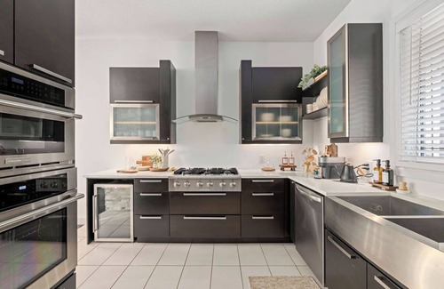 The fully equipped kitchen is ready for everything from a quick morning coffee to a full dinner spread, complete with sleek stainless steel appliances and bar seating for casual meals. Just off the kitchen, a charming dining area framed by a stone accent wall offers the perfect place to gather, whether you’re catching up with colleagues or enjoying a family dinner.