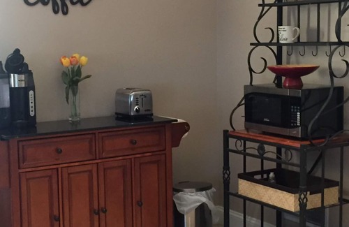 Kitchenette with Coffee maker (single cup ground or k-cups), toaster, microwave and refrigerator, Coffee & Tea provided. Also Hair Dryer, Iron & Ironing Board, TV & DVD player, Wireless Internet.