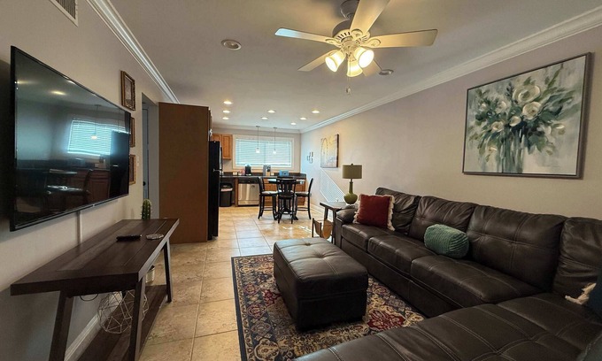 Two bedroom apartment with in-unit laundry, two queen beds. Larger bedroom has its own tv. This is a two bedroom one bathroom apartment located near LSU campus and Tiger Stadium. Convenient to downtown and the interstate. Your private apartment has central air, fast wi-fi, large kitchen, comfortable bedding, and access to the pool and one parking space. In-unit laundry is included for your convenience.