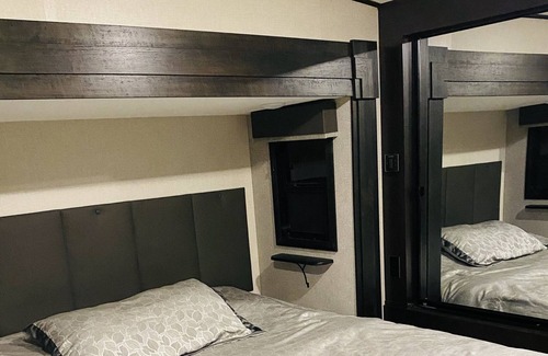 Enjoy our 2022 Mesa Ridge RV with two bedroom, 1,5 bathroom, kitchen, dining room/living room with 51 inch smart TV and electric fire place on our 10 Acre Farm. It is settled in between the large Pecan trees that make up our property. You will enjoy access to the game room where you can play pool, darts or watch the latest sporting event on the TV. There is a complimentary work area with monitor and keyboard. The Kitchen and the laundry room is also available for you.