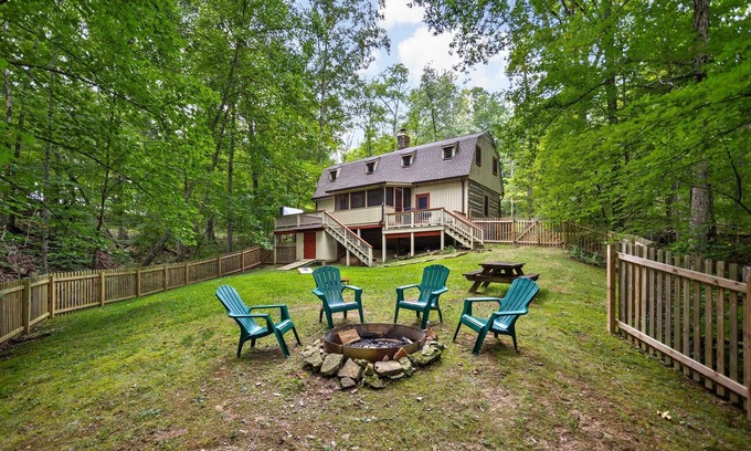 Saving the best for last, outback this cozy cabin has a screened-in porch and an uncovered deck. You'll enjoy the large private hot tub, fenced in backyard perfect for yard games (+ dogs/kids), and an outdoor bonfire pit.