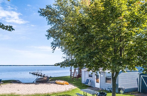 CLEAN rustic cozy cabin 7 steps from Houghton Lake. It features 2 private bedrooms with full-size beds and a living room with a fold-out full-size futon. The cabin features a private bathroom and kitchenette with a stove and refrigerator.