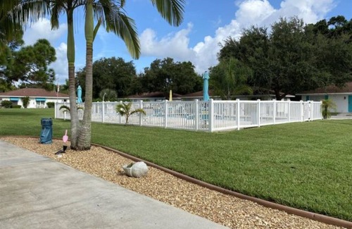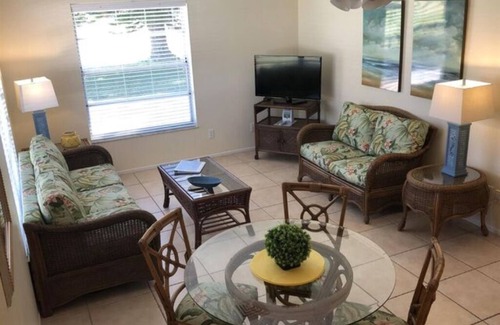740 Sq. Ft. - Sleeps 2-6. This VILLA SUITE overlooks the center lawn and pool; it has an outside seating area and free parking. Villa includes a GREAT ROOM consisting of living room with 36" HDTV, dining area for 4 and a full modern kitchen. There is a separate BEDROOM with a queen bed and a SECOND BEDROOM with 2 twin beds. A sleeper sofa (queen) is available on request. All rooms are fully tiled. This is a PET FREE VILLA.