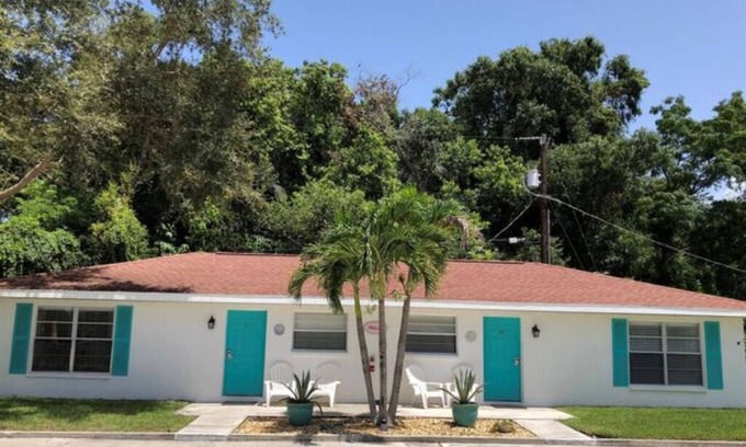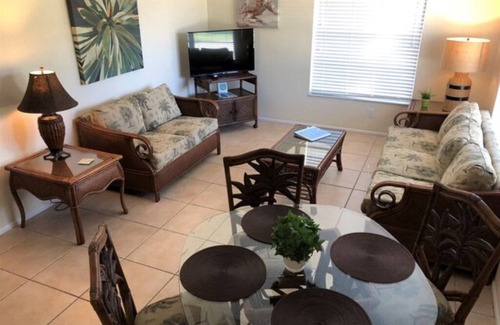 740 Sq. Ft. - Sleeps 2-6. This VILLA SUITE overlooks the center lawn and pool; it has an outside seating area and free parking. Villa includes a GREAT ROOM consisting of living room with 36" HDTV, dining area for 4 and a full modern kitchen. There is a separate BEDROOM with a queen bed and a SECOND BEDROOM with 2 twin beds. A sleeper sofa (queen) is available on request. All rooms are fully tiled. This is a PET FREE VILLA.