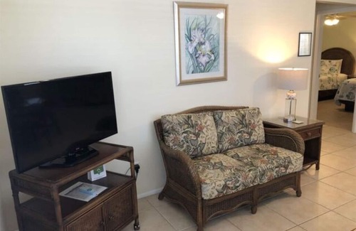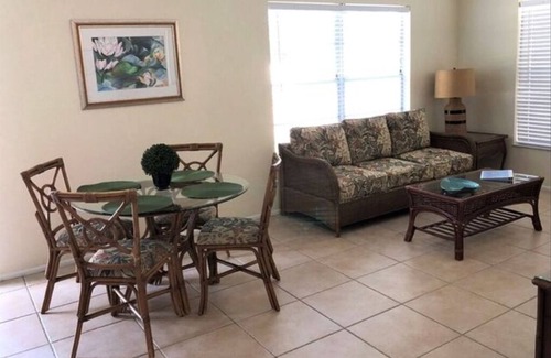 740 Sq. Ft. - Sleeps 2-6. This VILLA SUITE overlooks the center lawn and pool; it has an outside seating area and free parking. Villa includes a GREAT ROOM consisting of living room with 36" HDTV, dining area for 4 and a full modern kitchen. There is a separate BEDROOM with a queen bed and a SECOND BEDROOM with 2 twin beds. A sleeper sofa (queen) is available on request. All rooms are fully tiled. This is a PET FREE VILLA.