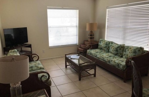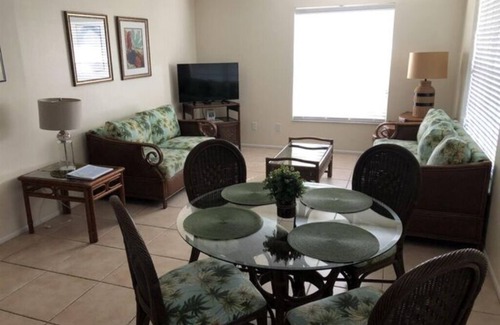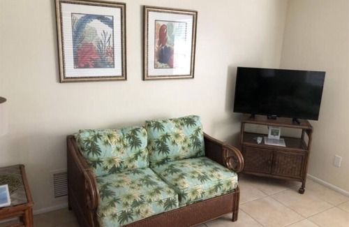 740 Sq. Ft. - Sleeps 2-6. This VILLA SUITE overlooks the center lawn and pool; it has an outside seating area and free parking. Villa includes a GREAT ROOM consisting of living room with 36" HDTV, dining area for 4 and a full modern kitchen. There is a separate BEDROOM with a queen bed and a SECOND BEDROOM with 2 twin beds. A sleeper sofa (queen) is available on request. All rooms are fully tiled. This is a PET FREE VILLA.