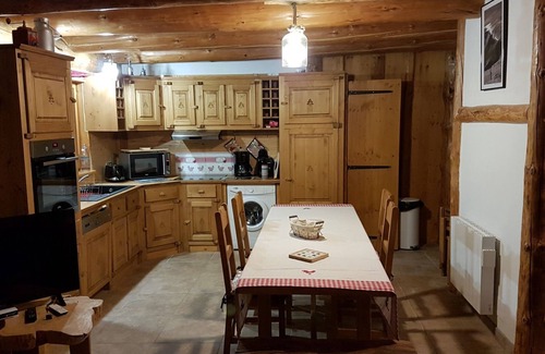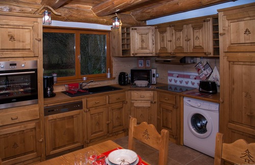 cuisine bois tout équipée : lave vaisselle, lave linge, four, four micro onde, cafetière tassimo, plaque induction, frigo avec conservateur, bouilloire électrique, grill pain, appareil à raclette, fondue,