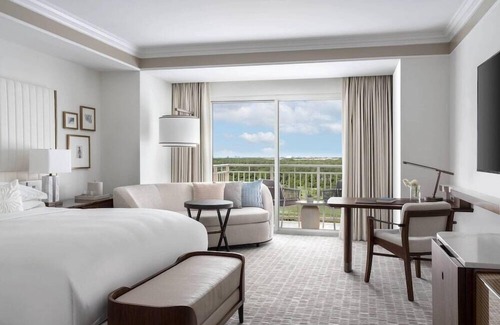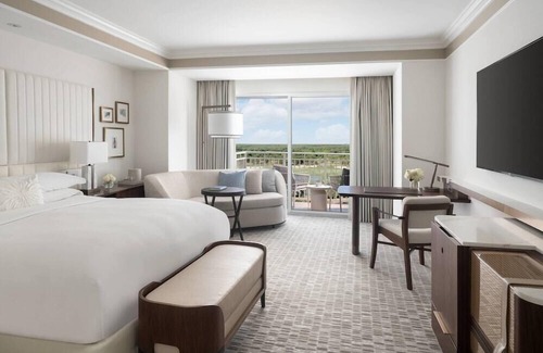 The living room of the Executive Suite, 1 King Bed at the Ritz-Carlton Orlando, Grande Lakes is perfectly suited to entertaining guests or relaxing in style, with a plush sofa and a selection of complimentary gourmet coffee, tea, and bottled water. French doors lead into the separate bedroom with one King-size bed, and the sliding glass doors in each room offer access to private balconies with garden and golf course views. The connecting Lake View, 2 Queen Beds guest room offers tranquil lake views from floor-to-ceiling windows and a private balcony and provide up to four members of your travel party their own 480 square foot space to relax in. This Italian-inspired Florida resort offers an 18-hole golf course, a 40,000-square-foot spa, and 11 on-site restaurants. Included in the Daily Resort Fee is transfer service to area theme parks, including the Walt Disney World Resort 14.4 km away. A satellite 65-inch HD LCD smart television, free bottled water, and iPod docking station are included in all guest rooms at the Ritz-Carlton Orlando Grande Lakes. Each marble bathroom is stocked with bathrobe and slippers. Select rooms feature a private furnished balcony. Guests can take advantage of the two-mile bike trail or walk around the resort. Kayaks, tennis courts, and three outdoor pools are available as well. The Ritz Kids Club is available for younger guests. Dining options include a southern cuisine restaurant, Caribbean and Latin Fusion restaurant and spa café serving salads and smoothies. The Lobby Lounge offers afternoon tea and evening cocktails accompanied by sunset views. The hotel is 4.8 km from SeaWorld and 11.2 km from the Universal Orlando Resort. The Orlando International Airport is 16 km away. Shopping at the Mall at Millenia and Orlando Premium Outlets is within 10.7 km. Guests are required to show a photo identification and credit card upon check-in. Please note that all Special Requests are subject to availability and additional charges may apply. In the event of an early departure, the property will charge you the full amount for your stay. Please note pets 25 lbs or more cannot be accommodated. Please note only 1 pet per room can be accommodated. The resort fee includes: • Enhanced High Speed Guest Room Internet • Mountain Bike Rental at Grande Lakes Sports (two bikes, one hour/day/room) • Driving Range Privileges • Two Pool Floats at the JW Marriott® Lazy River Pool • Two Welcome Beverages per room • Tennis Court access (one hour/day/room) • Fitness Center Classes (one/day/room) • $50 print credit towards any Photography Concierge package