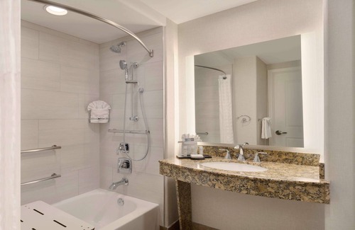 The 2 Room Suite - 1 King Bed is a modern study in desert-inspired style and charm. The separate living room features a dining table for three which doubles as a large workspace, a commodious sofabed, a plush armchair, and sliding-glass door access to a spacious private balcony. The bedroom boasts a King-sized bed with premium bedding and blackout curtains to ensure a full night of deep sleep. A chic bathroom also adorns the space with a glass-enclosed shower, granite vanity, and deluxe bath amenities to enhance your morning routine. This suite is ideal for those seeking a one-bedroom suite in Tucson. On the northern edge of Tucson resides hotel, a modern hotel with classic desert-inspired design. A stay at this hotel places you in one of the more quiet areas of the city, just minutes away from Catalina State Park and the stunning foothills of Mt. Kimball. Start your day with a complimentary cooked-to-order breakfast featuring continental classics and then unwind at the evening reception with a variety of beverages and snacks. Make sure to take some time to enjoy the heated outdoor swimming pool, whirlpool, and fully-equipped fitness center in order to keep up with your workout regimen or just to relax.