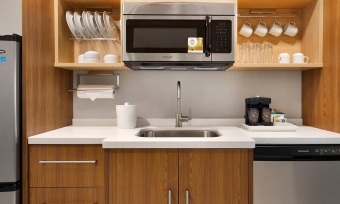 After a busy day, kick up your feet in the 1 King Bed Suite with Sofabed at Home2 Suites by Hilton Roanoke. This unique open floor plan includes three zones designed to maximize your stay. The kitchen area comes stocked with a refrigerator, microwave, dishwasher, and dinnerware. The quaint living area offers a sofabed with ottoman and a desk that rolls out into a dining table. A sliding partition allows for privacy in the sleeping sanctuary furnished with a King-sized bed covered with microfiber sheets. This accommodation is ideal for business or leisure travelers seeking a studio-style suite in Roanoke. Set right opposite the many shopping, eating and entertainment venues of Valley View Mall, Home2 Suites by Hilton Roanoke is ideal for extended stays and short breaks alike. With proximity to Roanoke-Blacksburg Regional Airport, this hotel also places you close to Mill Mountain Park’s hiking trails. Spread out in warm and casual suites with sofabeds, HDTV’s, complimentary WiFi and functional kitchenettes where you can assemble a quick meal at the end of the day. Enjoy the cozy comfort of a separate living room when you reserve the one-bedroom suite. Guests are treated to perks such as free parking and airport shuttles. Other on-site facilities include a terrace with barbecue facilities and fireplace, coin-operated laundry, fitness room, and an indoor saltwater pool.