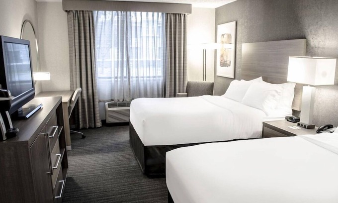 2 Queen Beds336 sq feet (31 sq meters)Internet - Free WiFi Entertainment - Flat-screen TV with premium channelsFood & Drink - Refrigerator, coffee/tea maker, and room serviceSleep - A pillow menu Bathroom - Private bathroom, bathtub or shower, free toiletries, and a hair dryerPractical - Phone, iron/ironing board, and desk; rollaway/extra beds available on requestComfort - Air conditioning and daily housekeepingNeed to Know - No cribs (infant beds) availableNon-SmokingConnecting/adjoining rooms can be requested, subject to availability With a stay at Holiday Inn Fargo in Fargo, you'll be a 1-minute drive from West Acres Mall and 7 minutes from North Dakota State University. This hotel is 5.7 mi (9.2 km) from Fargodome and 3.2 mi (5.1 km) from Scheels Arena.