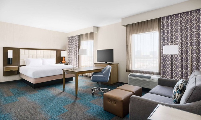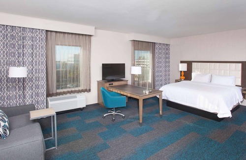 The 1 King Studio Suite Nonsmoking + 2 Queens Nonsmoking at Hampton Inn & Suites LAX El Segundo is a spacious suite with a connecting room which provides additional comfort to your Los Angeles experience. The grand living area features an oversized work desk, sleeper sofa, and entryway with wet bar and plenty of counter space. While the suite’s sleeping area boasts a King-sized bed, the connecting room provides two Queen-sized beds. Both the suite and connecting room offer blackout curtains to facilitate a deep night’s sleep. Two stylish bathrooms adorn this suite with glass-enclosed couple’s showers, chic vanities, and extra space to elevate your morning routine. This suite is ideal for those seeking a studio suite with connecting room in Los Angeles. Tucked away in one of Los Angeles’ posh neighborhoods, Hampton Inn & Suites LAX El Segundo is perfect for those making a quick business-related stop or are planning a long-term stay alike. This hotel puts you right next to LAX airport and just minutes away from Dockweiler Beach, The Forum, and Lakes at El Segundo golf course. After a long day exploring the city and enjoying its beaches, unwind in the Flight Deck Lounge, the hotel’s own lobby bar which features small-plate cuisine, specialty cocktails, and local draft beers. Make sure to take some time to swim in the indoor pool and take in some California sun on the outdoor patio to optimize your relaxing L.A. experience.