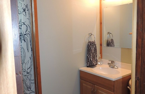 The property owners live part-time in the lake facing cabin ("Cabin 1"), but will not be staying onsite during your stay. Your group will have full access to the back two cabins ("Cabin 2” and "Cabin 3"). Cabins 2 & 3 are always rented together. Each cabin has a full bathroom and a fully equipped kitchen. These little cabins are clean, comfortable, and cozy. Each cabin has air conditioning. The back two cabins sleep 8 people in beds. Cabin 2 has two bedrooms, sleeping 5 people in beds – the first with a queen bed and the second with twin bunks plus a twin bed. Cabin 3 has one bedroom, sleeping 3 people in beds – a full bed and a twin bed.